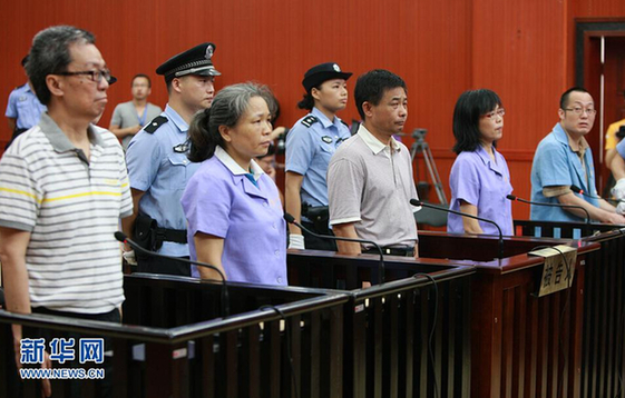 6月4日,被告人安明明、冼惠英、郭其辉、陶智梅、莫浩锋(从左至右)等人在法庭上受审。