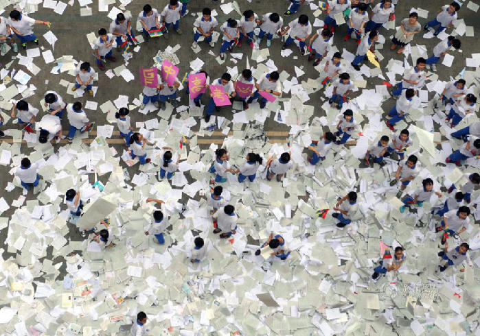 2014年6月4日,广州市,广州大学附属中学高三、初三学生将废弃试卷扔出教室,释放压力,迎接即将到来的考试。
