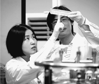 颜宁(左)指导研究组成员邓东做实验。