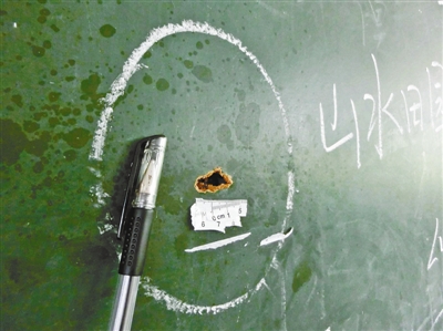 如果不仔细看,很容易忽略黑板上的弹孔。学校的老师说,弹孔是警察狙击手击毙张泽清时留下的,后来警察勘查现场画了圈、贴上了“标记”。昨天下午,仍有几辆警车开进学校,有警察走进六(4)班教室勘查。