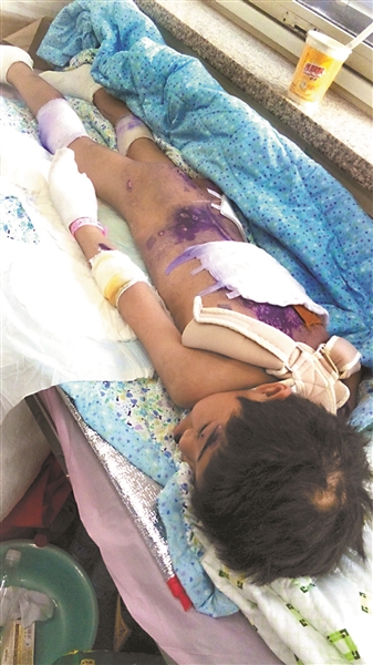 童童的妈妈张雪梅告诉北青报记者,在保定的医院诊断后显示,童童的锁骨、脚趾骨和手指骨具有不同程度骨折,身体有大量外伤,脑部受到伤害。