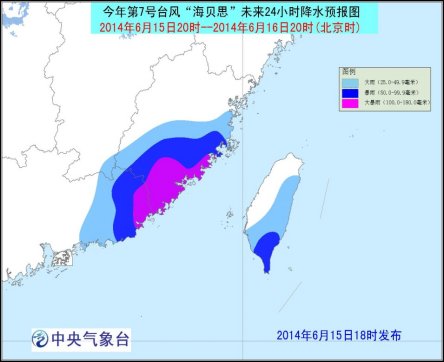 预计,“海贝思”将以每小时15-20公里的速度向偏北转东北方向移动,强度逐渐减弱。15日20时至16日20时,南海东北部海面、福建中南部沿海、广东东部沿海、台湾海峡将有6-7级大风,部分海域或地区的风力有8级,阵风可达9级;广东东部、福建南部和东部、台湾东部和南部有大到暴雨,广东东部偏东地区、福建东南部的部分地区有大暴雨(100-180毫米)。