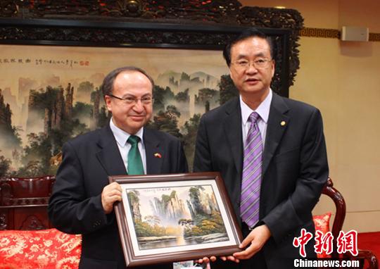 湖南省副省长李友志(右)会见厄瓜多尔驻华大使何塞?博尔哈,并互赠礼物。 罗心锦 摄