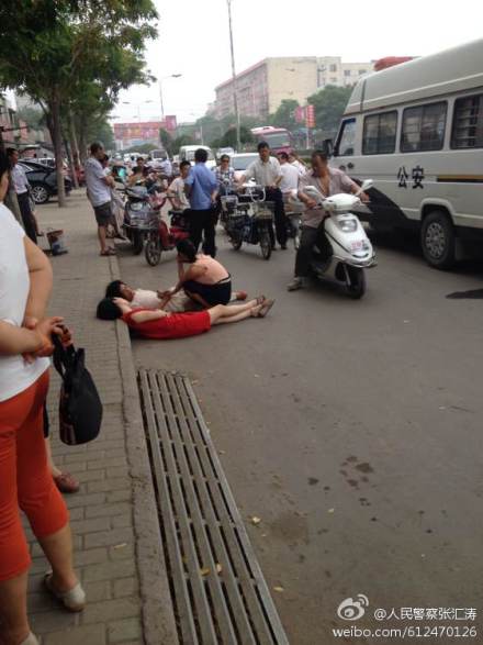 这名网友连发3张现场图片,图上可见,一上身穿浅色T恤的年长女子躺在车道上,头枕人行道沿,而身旁一姑娘蹲在地上,拉着她的手。而她们旁边一名身穿红色连衣裙的女子也头枕人行道沿躺在车道上。