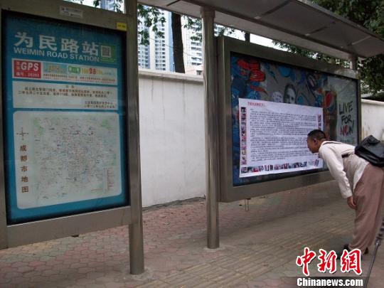 成都一男子全城公交站台贴鸡毛信寻四川首富之女。 陈丽媛 摄