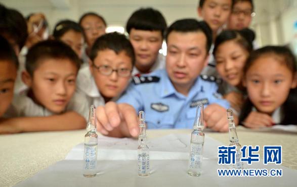 6月24日,河北省邯郸市公安局禁毒支队民警给渚河路小学的学生们介绍毒品带来的危害。世界禁毒日到来之际,各地纷纷开展禁毒宣传进校园活动,让孩子们认识毒品、远离毒品。6月26日是国际禁毒日,今年的主题是“珍惜美好青春,远离合成毒品,拒绝毒品,健康人生”。 新华社发(郝群英 摄)