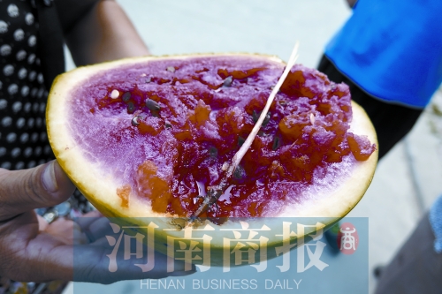 河南商报记者看到,红红的瓜瓤内,一根黄色茅草翘着,约有18厘米长,另一头插在瓜瓤里,相邻的西瓜外表皮上,有一个已发黑发蔫的小孔。