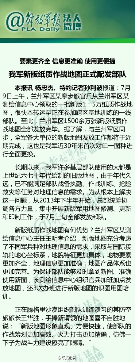 全军各大单位的新版地图发放工作将于近期完成,这也是我军近30年来首次对单一图种进行全面更换。新版地图充分考虑了不同军兵种对地理信息的需求,