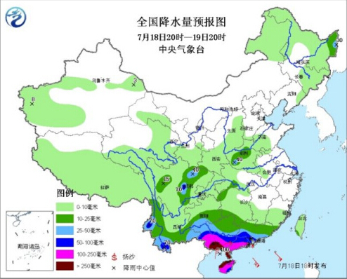 18日20时至19日20时,华南中南部、云南西部和南部、四川盆地西部等地的部分地区有大到暴雨,其中,广西中南部、广东西南部、海南西部和北部等地有大暴雨,局部地区有特大暴雨(250~400毫米)。南海西北部和中西部、西沙群岛附近海域、琼州海峡、北部湾以及海南沿海、广东中西部沿海、广西沿海将有7-9级大风,其中南海西北部、琼州海峡、北部湾、海南东部和北部沿海、广东雷州半岛沿海、广西沿海的部分海域或地区将有10-13级大风,台风中心经过的附近海域或地区的风力有14-17级,阵风可达17级以上