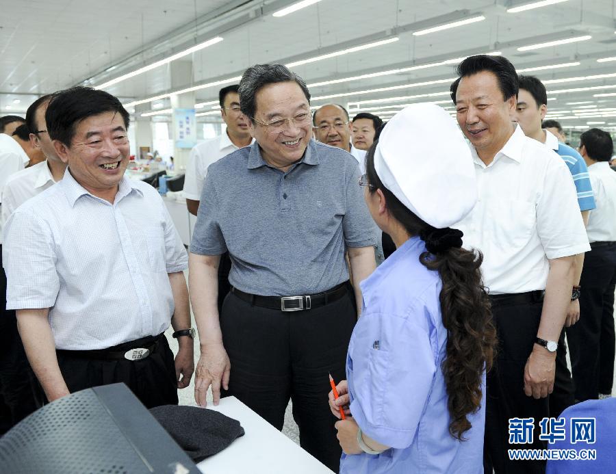 这是7月18日,俞正声在鄂尔多斯羊绒集团现代羊绒产业园与职工交流。新华社记者 张铎 摄