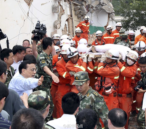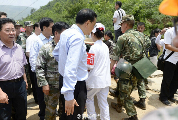 新华网北京8月4日电 据新华社“新华视点”微博报道,“让伤员先走!”8月4日,李克强总理来到云南鲁甸地震震中龙头山镇考察灾情,在察看废墟上救援情况时,几名战士抬着刚获救伤员走出,李克强主动让道,并抬起手臂护送队伍离开。考察中,李克强多次遇到抢救伤员的队伍,他都主动招呼随行人员让道保证救援顺利进行。