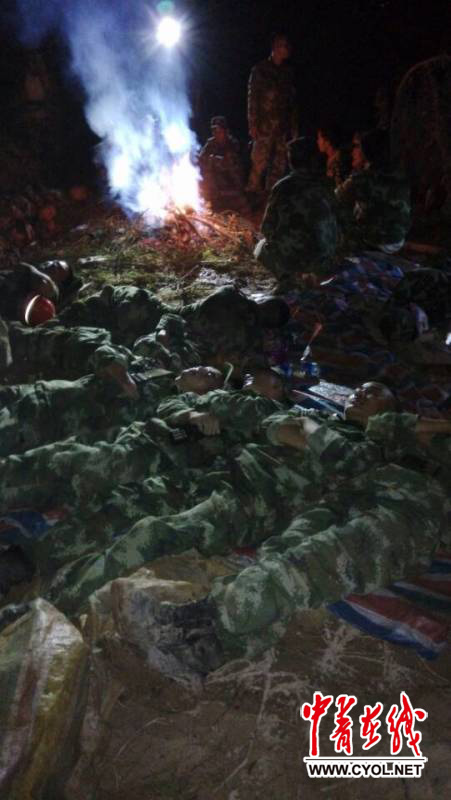 8月5日下午20时左右,正在巧家县包谷垴乡参加堰塞湖抢险的武警8750部队的25名党员组成的党员突击队,在运送、安放炸药后返回的路上,道路被山体滑坡阻断,被困在堰塞湖附近,至今未能脱险,官兵们靠生火取暖。