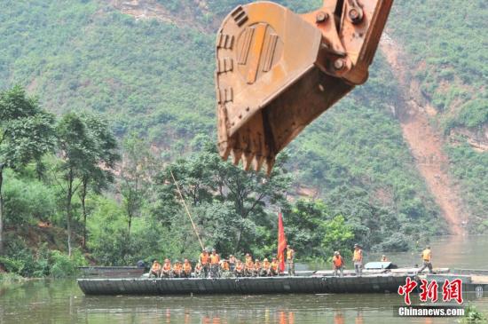 在烈日的炙烤下,紧张作业的官兵们每一个人都是满头大汗,时间已经是下午两点,所有人都还在紧张的忙碌着,一个小时之前送来的午饭被放在路边无人理会。“我们一分钟都不想停,从5日凌晨到这里,我们营到一线的100人就分作两班昼夜不停的工作。一开始疏通道路,接着拼接门桥,现在主要是协助武警水电部队运送抢险机械和技术人员。”成都军区13集团军工兵团舟桥营二连指导员詹宇一边用对讲机联络实时工作情况一边对记者介绍,额头上的汗水顺着额角不停的往下滴。