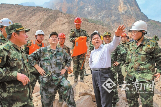 昨日上午,解放军副总参谋长戚建国、成都军区政委朱福熙和省委副书记、省长、云南抗震救灾指挥部总指挥长李纪恒及指挥部部分领导,率工作组专程前往牛栏江堰塞湖坝体实地察看,进行会商,对堰塞湖处置进行再部署、再安排。