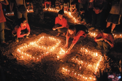 昨日,云南鲁甸地震头七祭,晚8点半,震中龙头山镇灾民安置点,志愿者和灾民一起为鲁甸地震中遇难的同胞默哀3分钟,并且用烛火摆成心形为遇难者祈福。新京报记者 侯少卿 摄