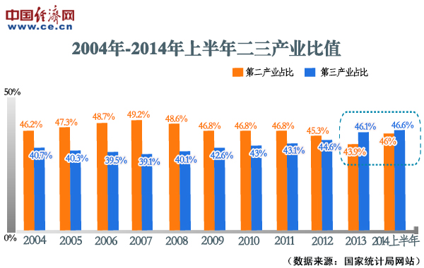 中国经济网通过梳理历年数据发现,从2013年开始,我国第三产业增加值占GDP比重达46.1%,首次超过第二产业;而刚刚公布的上半年经济数据显示,第三产业占GDP比重升至46.6%。