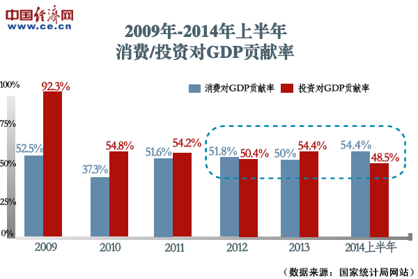 2009年-2014上半年消费和投资对GDP贡献率 郑汉星制图