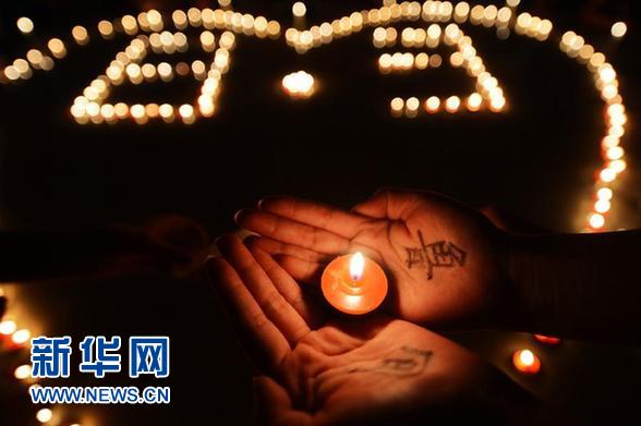 8月4日晚,江苏省扬州市广陵区的居民点燃蜡烛,为云南鲁甸地震灾区祈福。 新华社发(孟德龙摄)