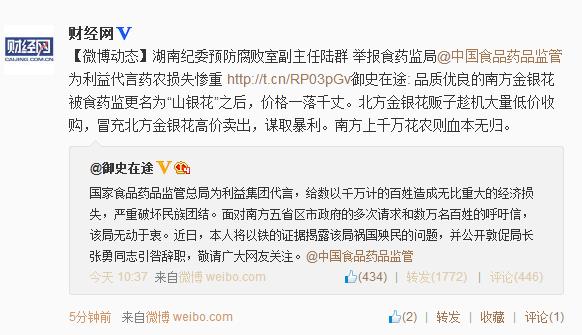 @财经网:湖南纪委预防腐败室副主任陆群举报食药监局(@中国食品药品监管)为利益代言药农损失惨重。陆群(@御史在途)说,品质优良的南方金银花被食药监更名为“山银花”之后,价格一落千丈。北方金银花贩子趁机大量低价收购,冒充北方金银花高价卖出,谋取暴利。南方上千万花农则血本无归。