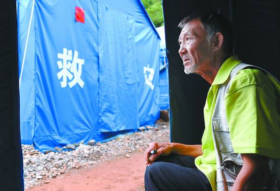 谢维礼老人在临时安置点的帐篷内向外张望(8月12日摄)。