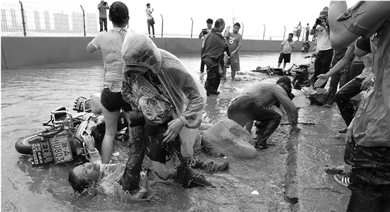 在浪打过来的一刹那,上百号人都冲到机动车道上。好多不知情的车主被吓了一跳。现场接连发生好几起擦碰事故,导致之江路沿线、进出城的双向、九溪路口以西位置,出现大堵车。