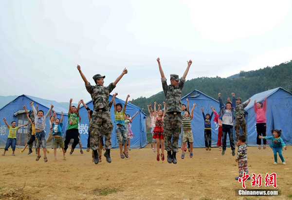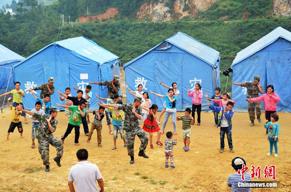 “你是我的小呀小苹果,怎么爱你都不嫌多,红红的小脸儿温暖我的心窝,点亮我生命的火,火火火火火。”为帮灾区孩子走出地震阴影,连日来,解放军陆军第十三集团军红军师炮兵团官兵在巧家县新店镇震区教小朋友跳小苹果。图为解放军教灾区小朋友跳“小苹果”。