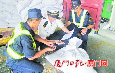 厦门海关人员检查美国转基因黄玉米