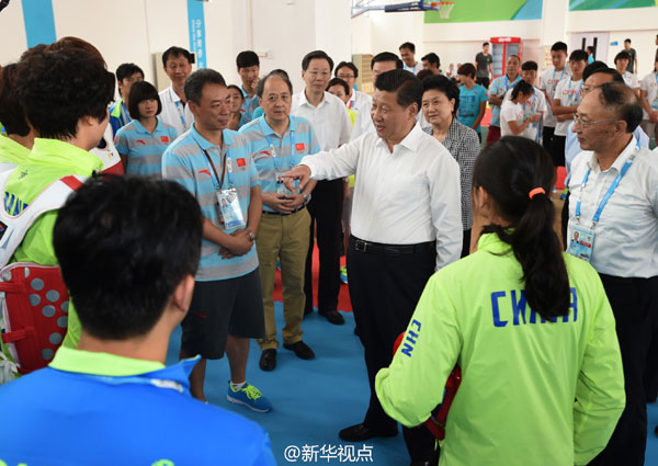 在青奥村训练馆篮球场边,习近平对队员和教练说,“三大球”要搞上去,这是一个体育强国的标志。比较而言,女子项目发展条件和基础更好些。我们的篮球排球有过辉煌,也有过高水平,可把篮球的目标定得更高点,争取拿到更好的成绩。你们这一代大有希望。