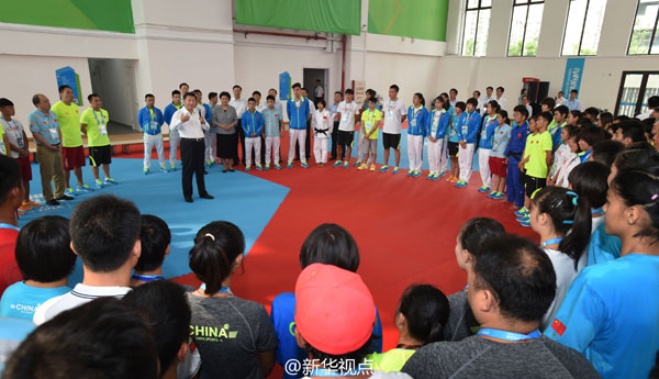 新华网北京8月15日电 据新华视点微博报道,第二届夏季青奥会开幕前夕,习近平总书记15日下午来到青奥会运动员村,亲切看望中国体育代表团,代表党中央、国务院、全国各族人民,向全体运动员、教练员、工作人员和志愿者致以诚挚问候,勉励大家努力践行“分享青春,共筑未来”的南京青奥会理念。