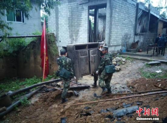 8月17日,昭通市永善县地震发生后,武警昭通支队永善中队15名官兵在中队长熊代程的带领下,立即奔赴灾区。一路上余震不断,山石滚落,熊代程果断下令徒步向灾区挺近。经过2个多小时的艰难行进,永善中队15官兵已于08时45分抵达震中务基镇波车区社展开救援。 中新社发 钟欣 摄