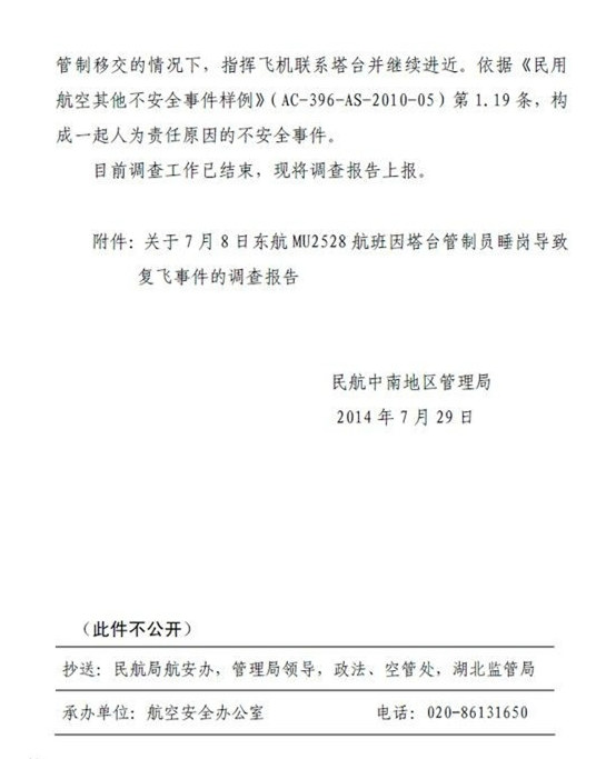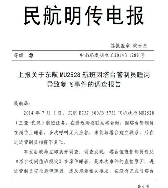 中国日报网民声天下:【东航MU2528航班因塔台管制员睡岗导致复飞】7月8日,东航MU2528(三亚—武汉),在武汉进近阶段联系塔台时,因塔台管制员在岗位上睡着,多次呼叫无人应答,未能与塔台建立联系,后在进近管制员指挥下复飞,经进近指挥向塔台电话联系后,此过程复飞12分钟之久安全落地。