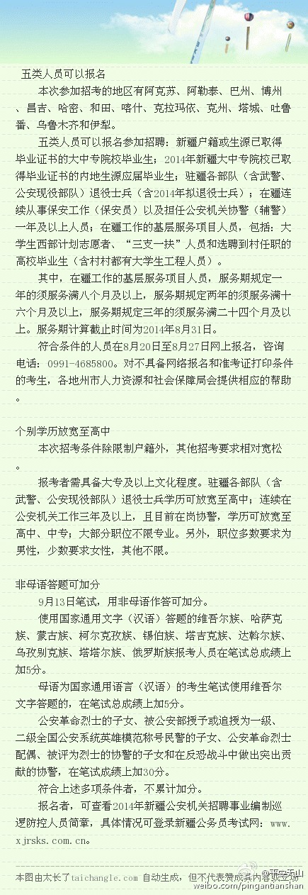 @平安天山:新疆公安机关将招聘3000名事业单位编制专业巡逻防控人员。符合条件的五类人员可以在8月20日至8月27日期间网上报名。咨询电话:0991-4685800。对不具备网络报名和准考证打印条件的考生,各地州市人力资源和社会保障局会提供相应的帮助。详文如下: