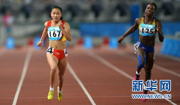 8月23日,梁小静(左)在比赛中。当日,在2014南京青奥会田径项目女子100米决赛中,中国选手梁小静以11秒65的成绩夺得冠军。 新华社记者 李响 摄