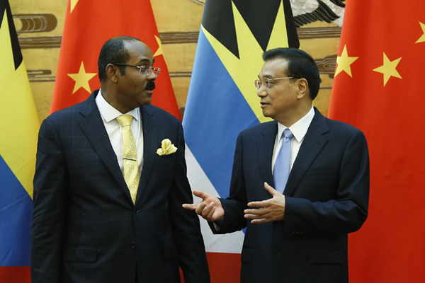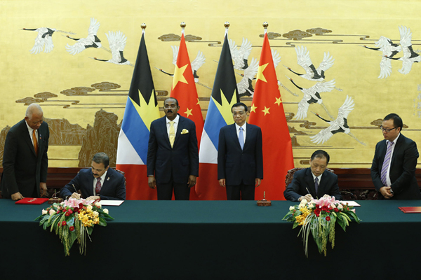 【李克强同安提瓜和巴布达总理布朗举行会谈】8月26日下午,国务院总理李克强在人民大会堂同安提瓜和巴布达总理布朗举行会谈。两国总理一致同意推动中安友好合作关系持续发展,提升中国与拉丁美洲和加勒比国家合作水平,共同维护广大发展中国家利益。