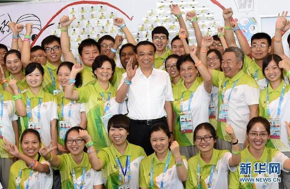 大厅里,几百名志愿者正在为闭幕式演出进行紧张排练,看到总理,他们纷纷围拢过来,李克强祝大家在闭幕式上的表演成功,为青奥会画上圆满的句号。他说,青奥会志愿者绝大多是学生,但也有一些中老年人,这说明志愿者精神吸引了不同年龄的人。国家要发展,老百姓要过上好日子,不仅要有物质发展,还要有精神追求,你们的志愿服务,展现了乐于助人、甘于奉献、敢于担当形象,青奥会不仅是运动员相互竞技的赛场,也是志愿者彰显社会道德力量的平台。你们作为无名英雄,虽然没有奖牌,但挂在胸前的服务标牌就是奖牌。他勉励大家更好地弘扬“奉献、友爱、互助、进步”的志愿者精神,汇聚起推动社会进步的巨大力量,为实现“两个一百年”的奋斗目标和中华民族伟大复兴的中国梦、为促进世界各国人民特别是青年之间的友谊而不懈努力。