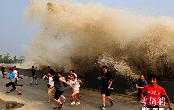 2014年8月30日,农历八月初六,钱江大潮在杭州下沙七格江堤再掀巨浪,大批观潮者沐浴大潮,有惊无险,享受大潮魅力。中新社发 陈加华 摄