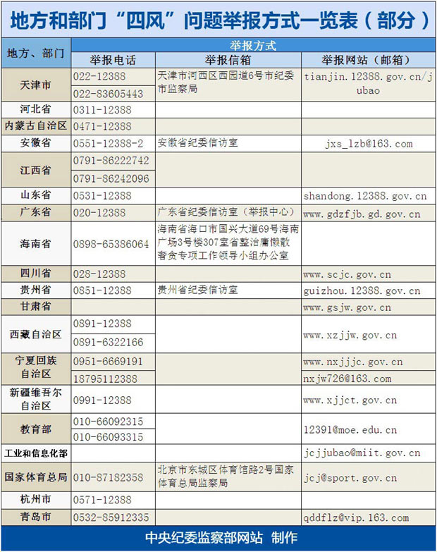 中秋、国庆临近,为严防“四风”问题反弹,继中央纪委监察部网站开通“公款送月饼等‘四风’问题举报窗”之后,一些地方和部门陆续出台禁令和措施,并公布了电话、邮箱等举报方式,畅通渠道,欢迎广大群众监督举报,狠刹两节期间的不正之风。