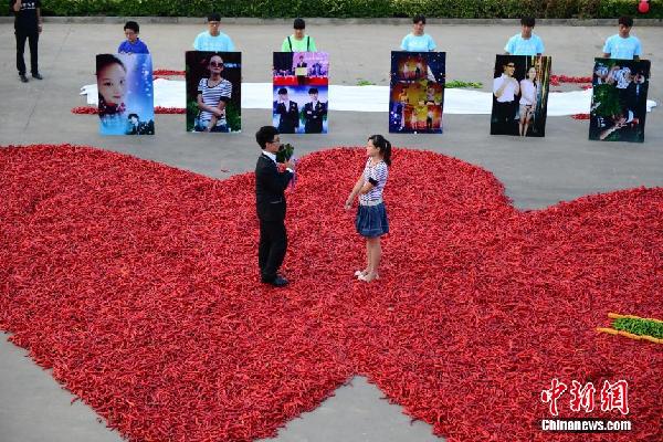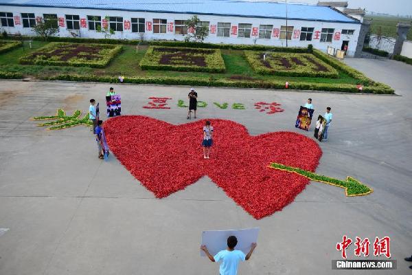 8月29日,河北省邯郸市鸡泽县一小伙在一辣椒加工企业上演浪漫一幕,他用九万九千九百九十九只红辣椒摆成巨大“心”形,向心仪已久的女友表白求婚,让在场的人们见证这一浪漫温馨时刻。 中新社发 胡晓华 摄