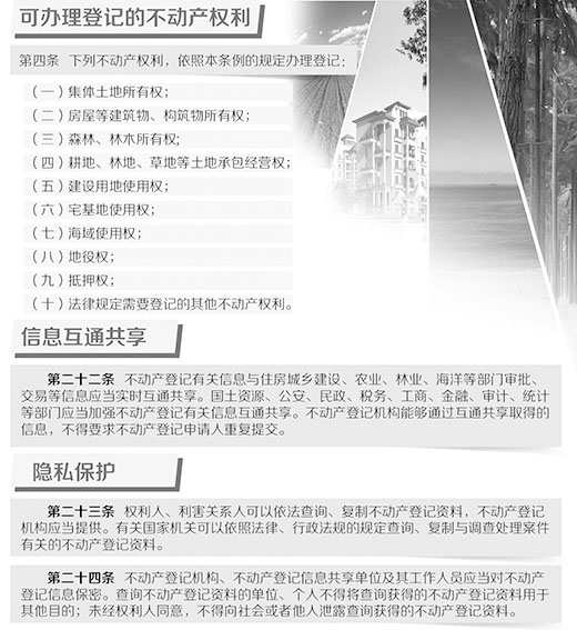 实行不动产统一登记后,哪些不动产需要进行登记?登记是自愿还是强制?公民隐私如何保护?登记会对房地产市场带来怎样的影响……围绕这些社会普遍关心的问题,记者进行了采访。