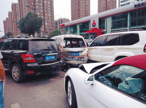 据张先生介绍,当时北二路东西方向是红灯,被撞的4辆车都在排队等信号,但在中间道行驶的白色保时捷应该是想往右侧并道,没想到一下子撞到前方的微型面包车。“我怀疑是把油门当刹车踩了。”
