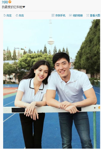 凤凰体育讯 北京时间9月9日刘翔在微博上发布女友的合影。在微博里,他发布了和女友趴在跨栏上的照片,并且附注说:“我最爱的它和她。”刘翔第一次公开了自己与女友的亲密照。