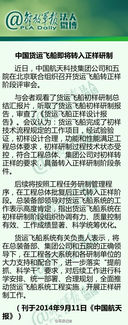 @军报记者【中国货运飞船即将转入正样研制】近日,中国航天科技集团公司和五院在北京联合组织召开货运飞船转正样阶段评审会。与会者审查了《货运飞船正样设计报告》。据了解,货运飞船系统,将在总装备部、集团公司和五院的正确领导下,在工程各大系统和各研制单位的大力支持和配合下,开展正样研制工作。以下为详文: