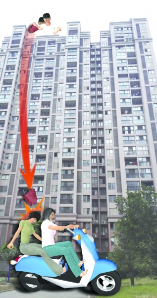 2009年4月18日,广州海珠区东风村马基大街骏丰时装厂附近,凌女士抱着三个月大的女儿欢欢回家途中,半块红砖从高空飞坠而下,砸中欢欢头部致其死亡。次日,警方找到肇事者——一名年仅12岁的男孩,他当时在天台上与6岁的堂弟和1岁半的亲弟弟玩耍,失手将砖头扔下砸中女婴。男孩家经济困难,两个家庭最后达成9万元赔偿协议。
