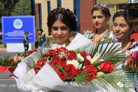 美丽的塔吉克斯坦少女用鲜花欢迎习大大,用塔语说:欢迎尊贵的客人。
