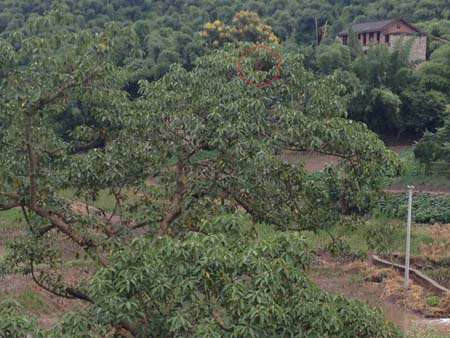 目前仍挂在树上的蜂窝(红圈内)。