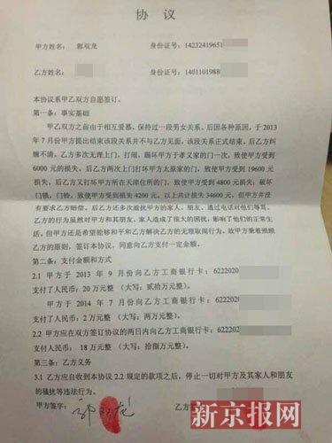 连日来,新京报网多次曝光官员给情人的保证书和协议书,引起网友热议。今日,山西一名女士向新京报(官方微信:bjnews_xjb)爆料称,自己和山西孝义市环保局干部郭双龙签署过一份“包养终止协议”,“分手费”达40万元。