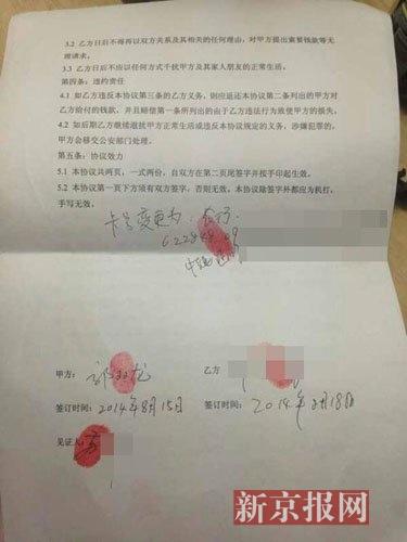 除了甲乙双方,这份协议上还有见证人苏某的签名和手印。据了解,苏为当地一村委会主任,9月12日,他在电话中向新京报证实这份协议的存在,“她去人家家里闹,现在签了协议,又反悔了。”