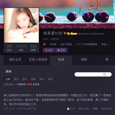 “原想按照爸爸妈妈的意愿找一份稳定的工作,就应聘了一家单位的工会文体岗位,面试也不错,但是前段时间又接到了新戏,读了四年表演,真心不想放弃。所以并未到该单位工作。”昨日下午2时54分,菅某发微博回应称,确已通过北方车辆研究所文体岗位初试,但因不愿放弃表演,因而未入职。
