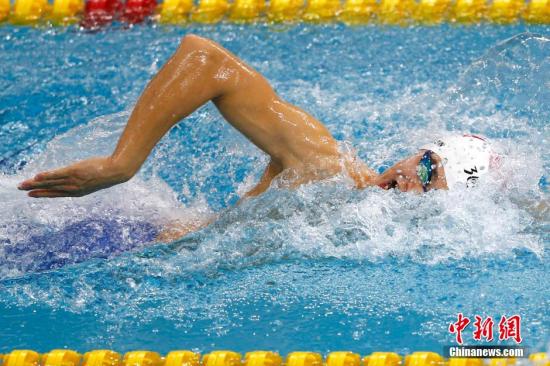 资料图:9月21日上午,仁川亚运会游泳比赛在文鹤朴泰桓游泳馆拉开大幕。在男子200米自由游预赛中,孙杨在第四组登场,最终以1分48秒90轻松取得小组第一,成功晋级。 中新记者 富田 摄