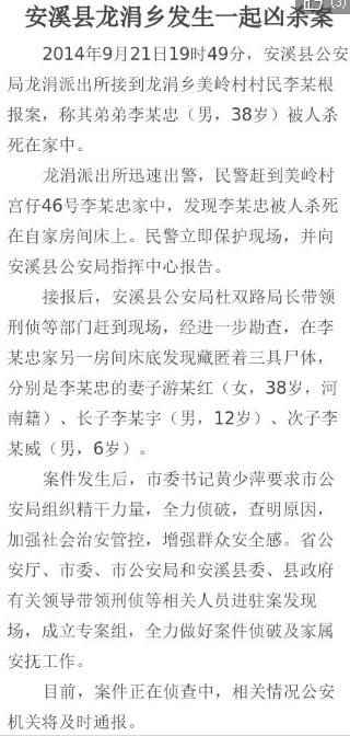 原标题:福建安溪一家四口被杀 最小受害者6岁